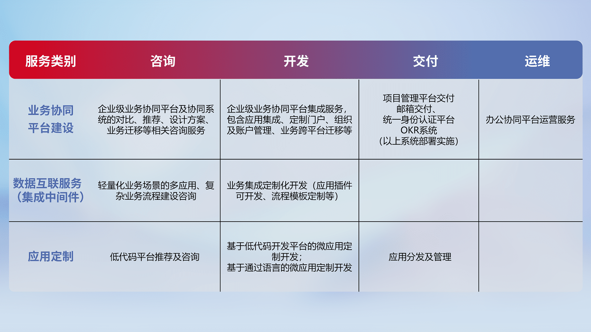 针对钉钉、、、、企微、、IDaas等平台级产品提供产品的规划、、、、方案、、交付、、、、定制化开发等服务,,实现如统一协同办公、、、、智能客户服务、、、混合会议管理、、智能数据查询、、、、等业务场景,,,,实现数字化转型。。。。
