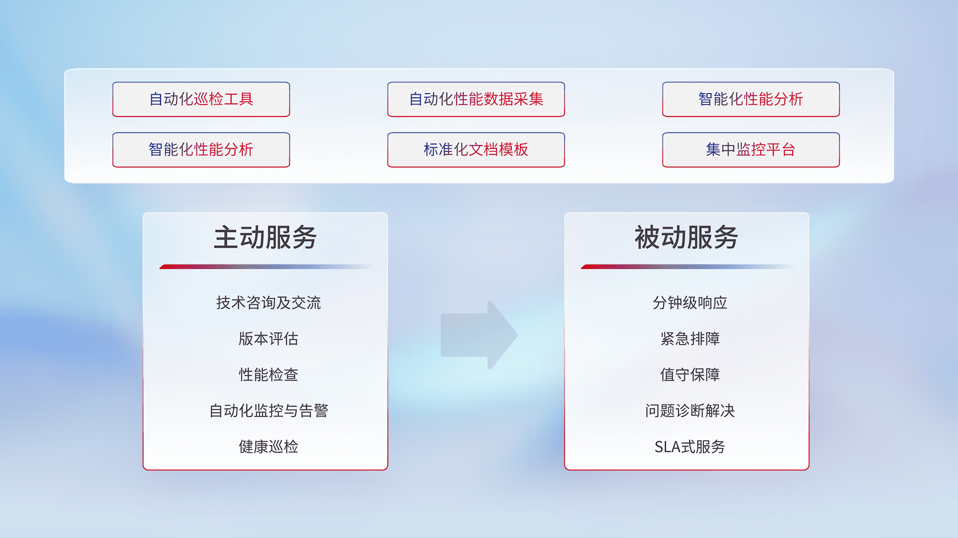 智能化工具和标准化文档,,,保障服务质量,,,,提供主动服务(包含技术咨询、、、、版本评估、、、性能检查、、、自动化监控与告警、、健康巡检)和被动服务包含(分钟级响应、、、紧急排障、、、值守保障、、、问题诊断解决、、、SLA服务)。。